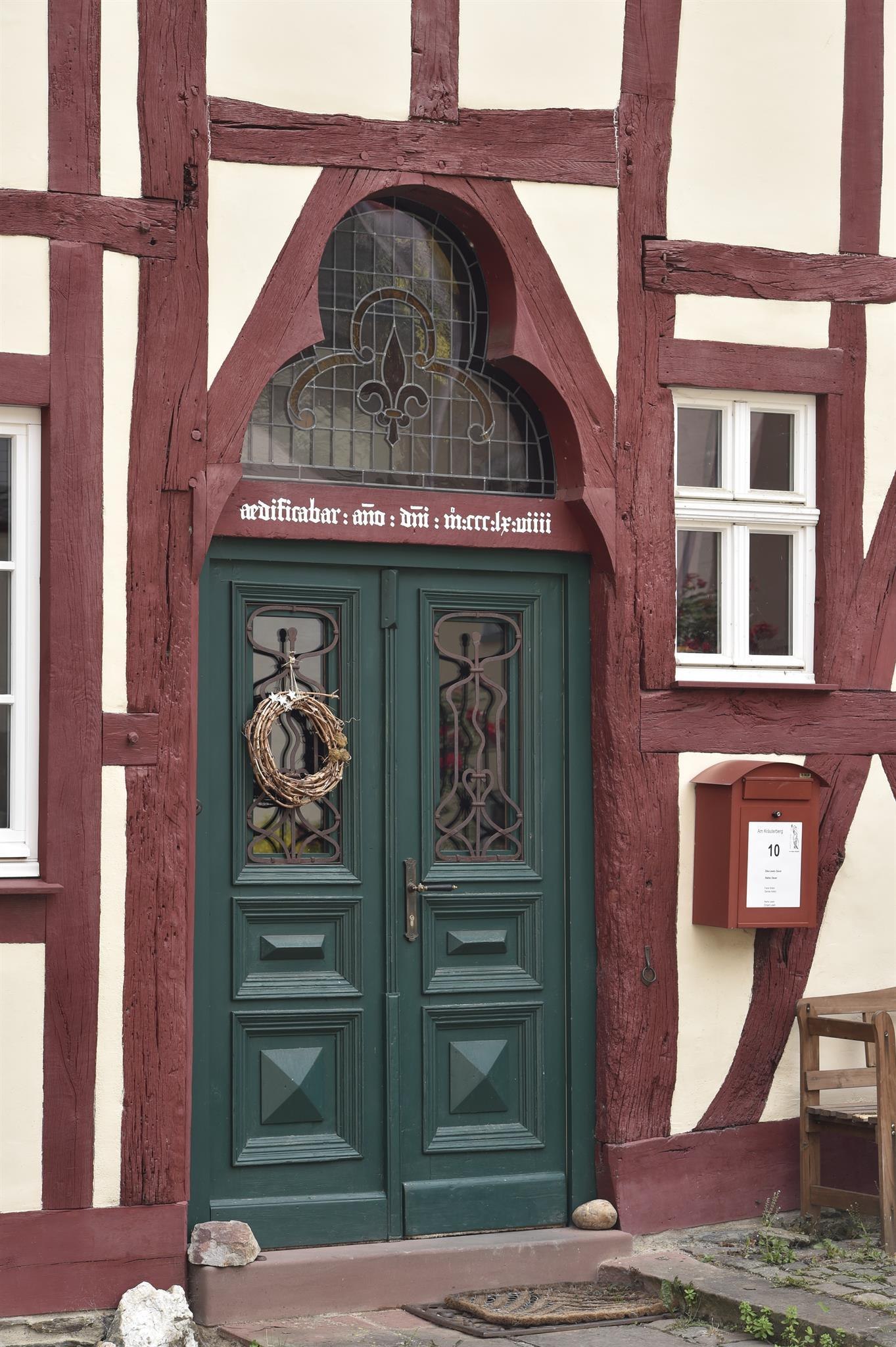 In its core a late Gothic residential building in post-and-beam construction (1368/69 d) with hall, barrel-vaulted cellar and well shaft on the first floor. The quarry stone wall on the eaves is probably older, possibly from a previous building. Half-timbered gable end with "tracery portal". Complete roof structure and half-timbering of the gable triangle heavily modified around 1800. Half-timbering on the upper floor of the eastern eaves side with six windows (window band), each equipped with fanlights and formerly vertical sliding shutters. The design of the windows and portal underlines the representative, possibly stately significance of the building. One of the oldest buildings on the Middle Rhine and of extraordinary importance for house research.