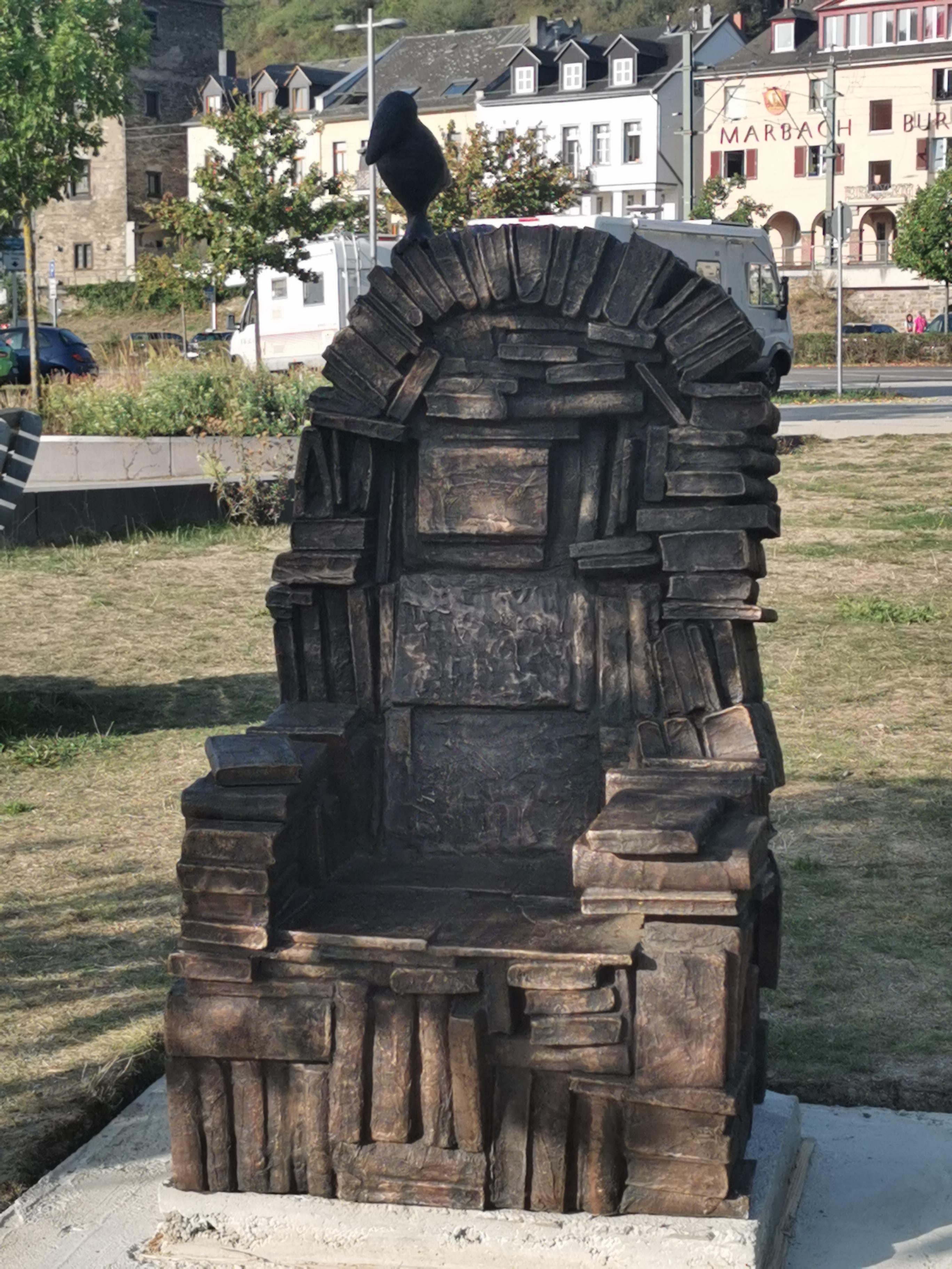 "Der Rabenstuhl der Poesie" ist entstanden aus 400 Büchern, die mit Gipsbinden umbunden wurden. Dies fertigten Schüler und Schülerinnen der Behinderten Schule "Liesel Metten" in Nieder-Olm an. Die Skulptur fand ihren Platz am Ufer des Rheins, direkt an der Promenade "An den Ufern der Poesie". Poesie ist die Ursprache des Menschen und so ist der Platz gut gewählt, ist doch der Rhein schon immer ein großer Influenzer, ein Zündfunken der Selbstaufklärung und der Poesie als Weltgespräch.