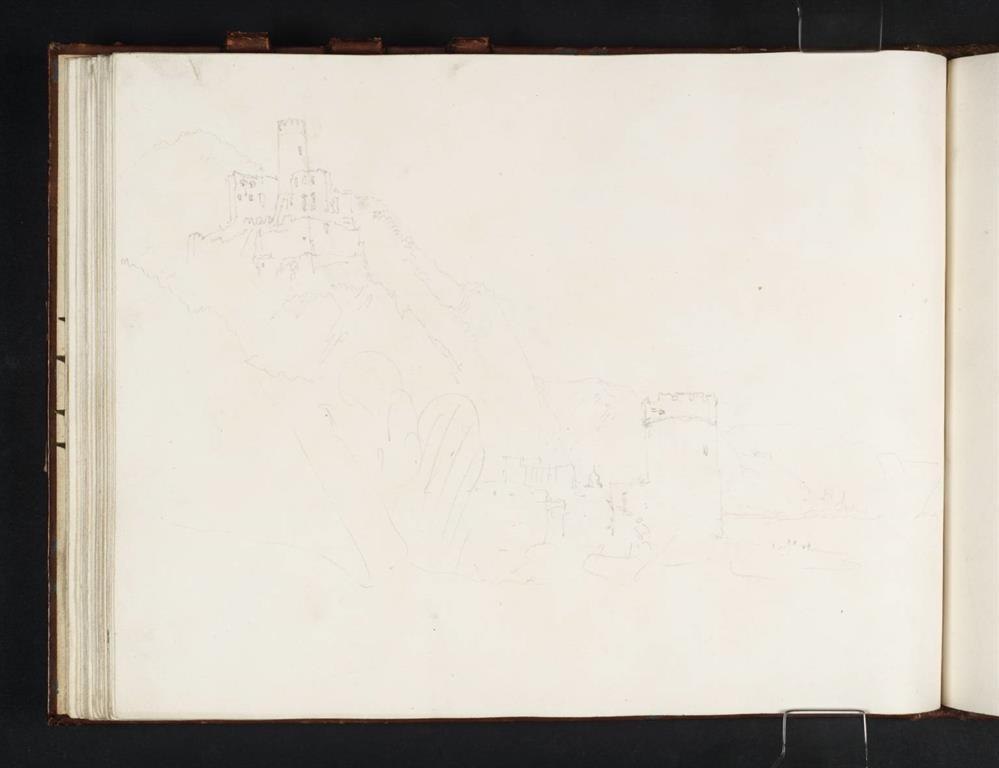 Auf seinem Fußmarsch hat Turner am 25. August 1817 Kaub und Bacharach bereits hinter sich gelassen, als er am Rheinufer entlang nach Rheindiebach gelangt. Das Aquarell basiert auf einer kleinen aber detaillierten Skizze und zeigt die Burg Fürstenberg, wie Turner sie von diesem Standpunkt aus gesehen hat. Das Motiv wird horizontal durch die historische Stadtmauer geteilt. Im Vordergrund sind Aktivitäten der hier lebenden Menschen dargestellt. Die Integration solcher Elemente ist typisch für Turners Werke.