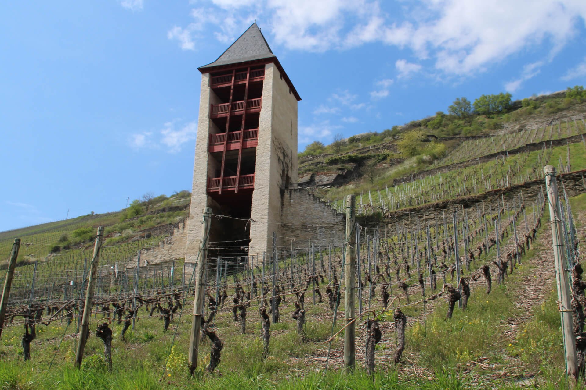 Der vielleicht etwas mühsame Weg zum Postenturm lohnt sich wirklich. Mit seinem weißen Anstrich ist er schon von weitem sichtbar. Von hier aus hat man einen einmaligen Panoramablick über Bacharach. Der Postenturm ist einer der herrlichsten Aussichtspunkte auf die "heimliche Hauptstadt der Rheinromantik". Von dieser Steillage aus haben viele Maler Bacharach in Bildern festgehalten und damit das mittelalterlich anmutende Stadtbild weltberühmt gemacht. Die Weinlage „Posten“ ist eine der bekanntesten Bacharacher Weinlagen. Von hier aus führt der Weg weiter zum Spitzenturm und den Orionsteig hinaug bis zum Aussichtpunkt "Heinrich-Heine-Höhe". Der Orionsteig ist benannt nach dem hier vorkommenden kleinen Orion-Falter (Fetthennenbläuling), dessen Raupe hier seine Nahrungsquelle, die Fetthenne findet.