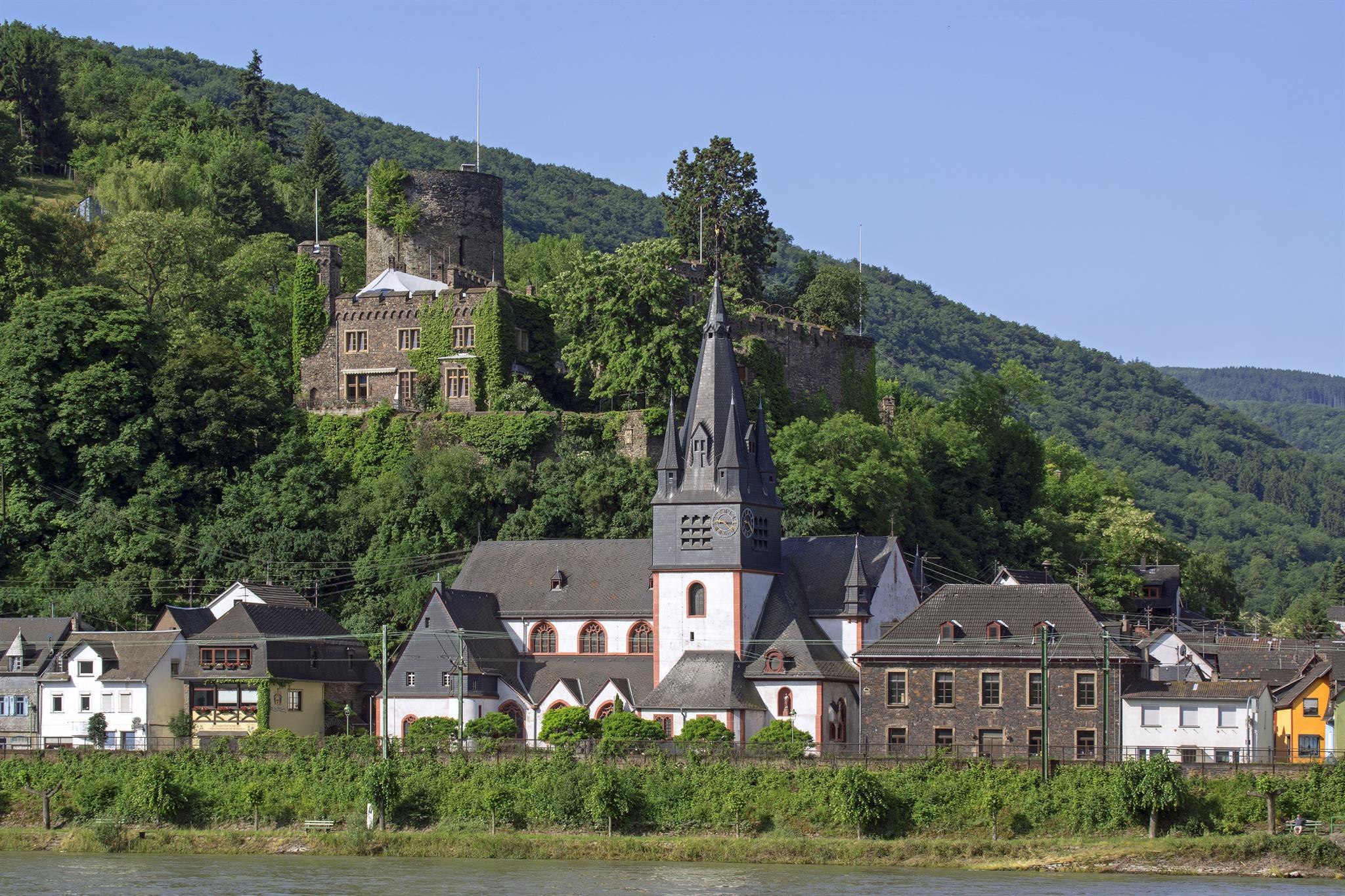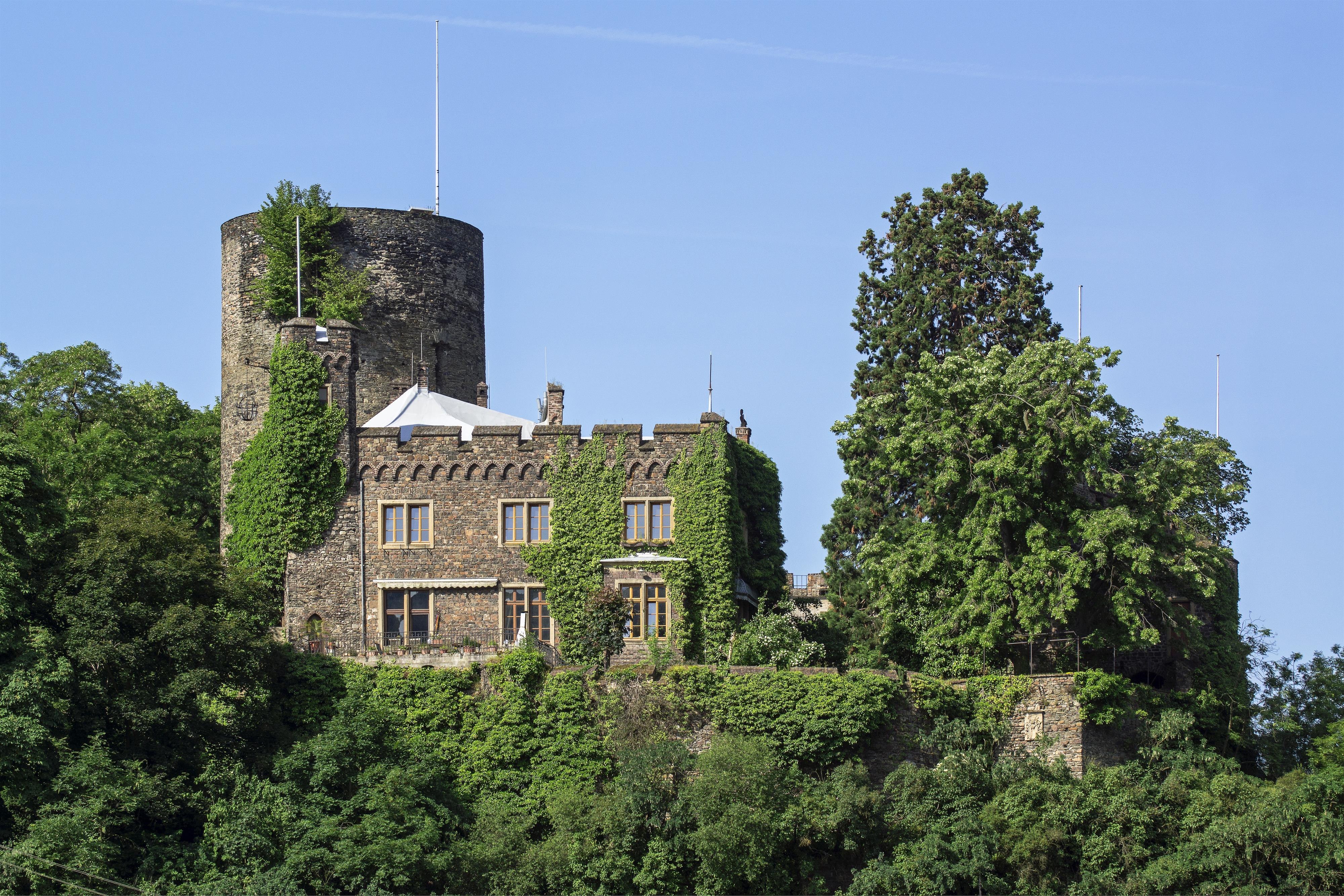 It is considered an example of the historicist reconstruction of a castle ruin, which was triggered by the Rhine Romanticism. Starting in 1295, the Archbishop of Mainz, Gerhard II von Eppstein (1230-1305), had the construction of Heimburg Castle begun at the confluence of the Heimbach and the Rhine. It was a reaction to the fact that in 1290 the Palatine counts had illegally appropriated the castles of Sooneck and Reichenstein. The roughly square castle still shows in its building stock a mighty shield wall facing the Rhine between two round towers. The southern one was extended to form a high keep. After destruction during the Thirty Years' War, the castle fell into ruin. The enthusiasm of noblemen and rich citizens for the charm of castle ruins on the Rhine led to many changes of ownership and the reconstruction of Heimburg in the 19th century. In the years 1866-68 the ruins were restored by order of the owner of the Rittergut, Baron Otto von Wackerbarth (1823-1904), incorporating the medieval substance. In the process, the two-story "Rhine Wing" was built over the medieval cellar in neo-Gothic architecture with battlements and corner towers. Later the castle came to Countess Charlotte von Mellin. From 1882, the wine merchant Eduard Rabeneck had the Rhine Wing extended and the neo-Gothic "Steward's House" with battlements and winter garden built in the garden. In 1898 the castle came to the industrialist Robert Müser (1849-1927), who acquired the mill and established a guesthouse there in 1910. In 1920 Nora Dunlop bought the castle for 1 million marks. The purchase was handled by her brother-in-law and cousin Hugo Stinnes, who was also the owner and general manager of the company "Hugo Stinnes GmbH". He was probably the most important German industrialist of his time. Many citizens of the village found work at the castle during the inflation period in construction maintenance work. The Heimburg served as a prestigious residence for the Stinnes family and their prominent guests for many years. The castle remained in family ownership until 1965. At present, the castle is not open to the public.