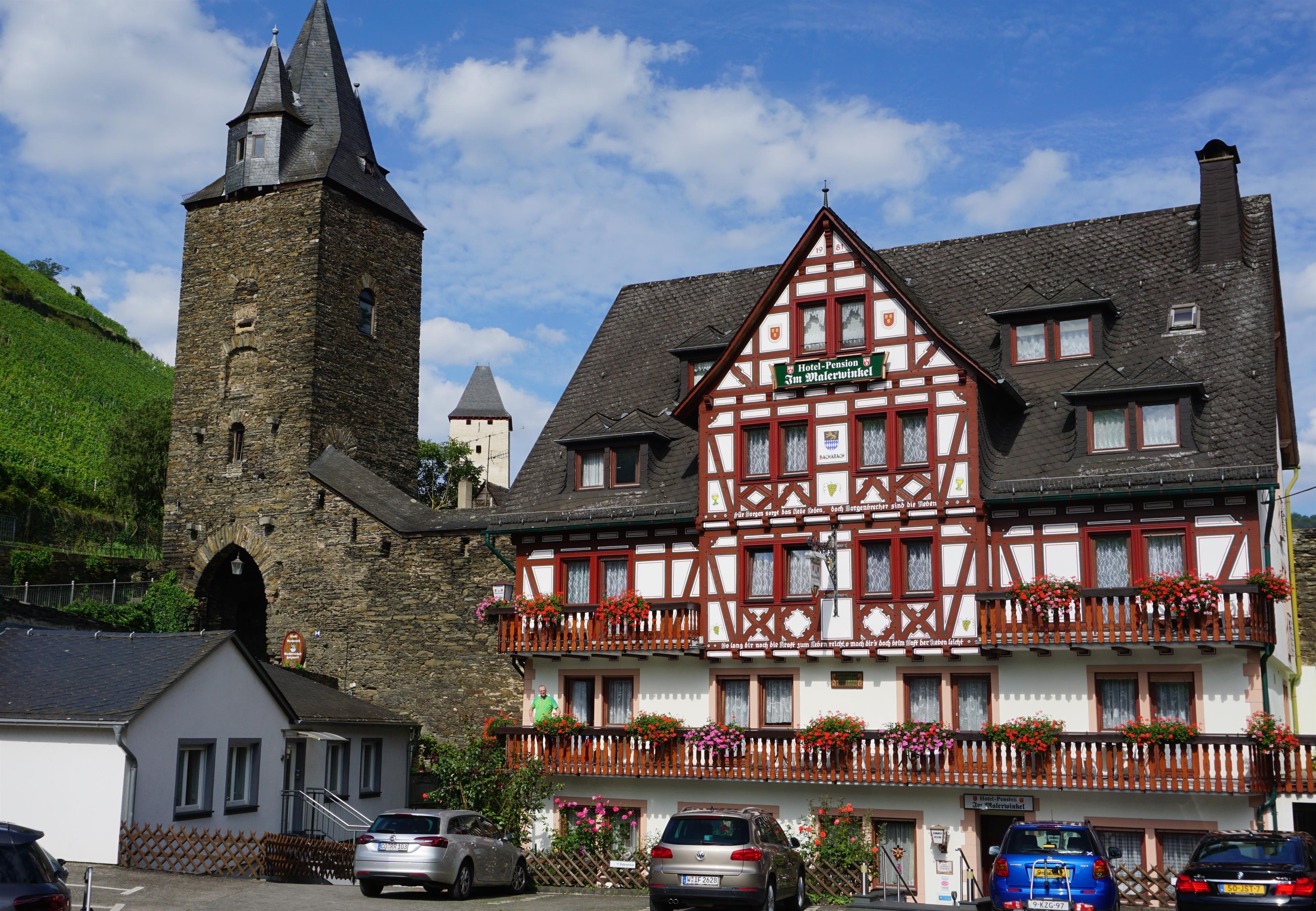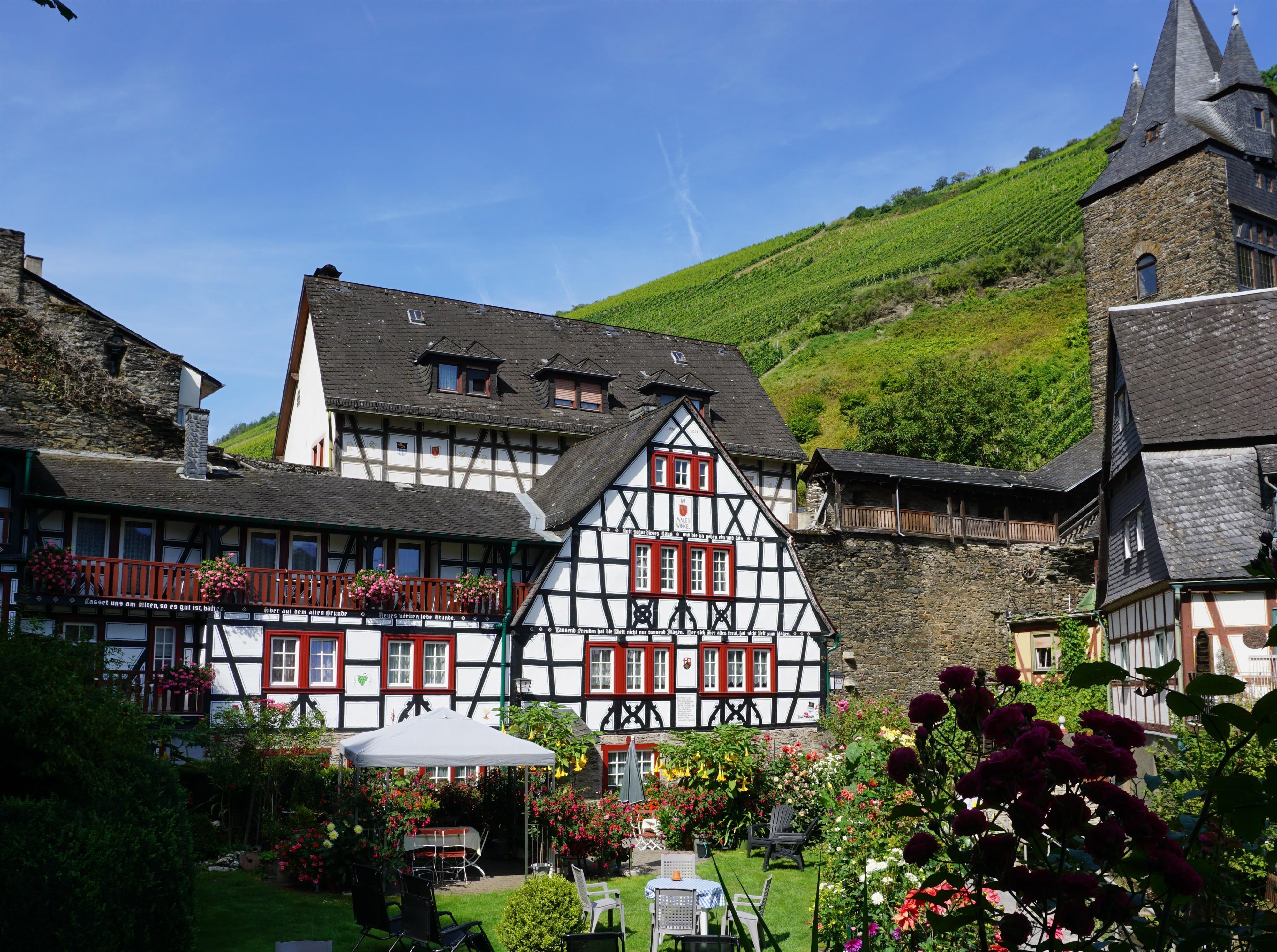 Our family-run house is located in a quiet area in an idyllic, picturesque corner, directly on the RheinBurgenWeg of the Rhine/wine town of Bacharach. Enjoy your vacation between weir towers and the historic city wall below Burg Stahleck, with a dream-like view of the vineyards and gardens. Our rooms, apartments, and vacation flat are modernly furnished. A large garden terrace with sunbathing area invites you to relax. There is a large on-site parking lot. Centrally located, you can reach the marketplace in a 2-minute walk and the Rhine promenade with boat docks in a 5-minute walk. Recommended wine taverns and dining establishments are nearby.