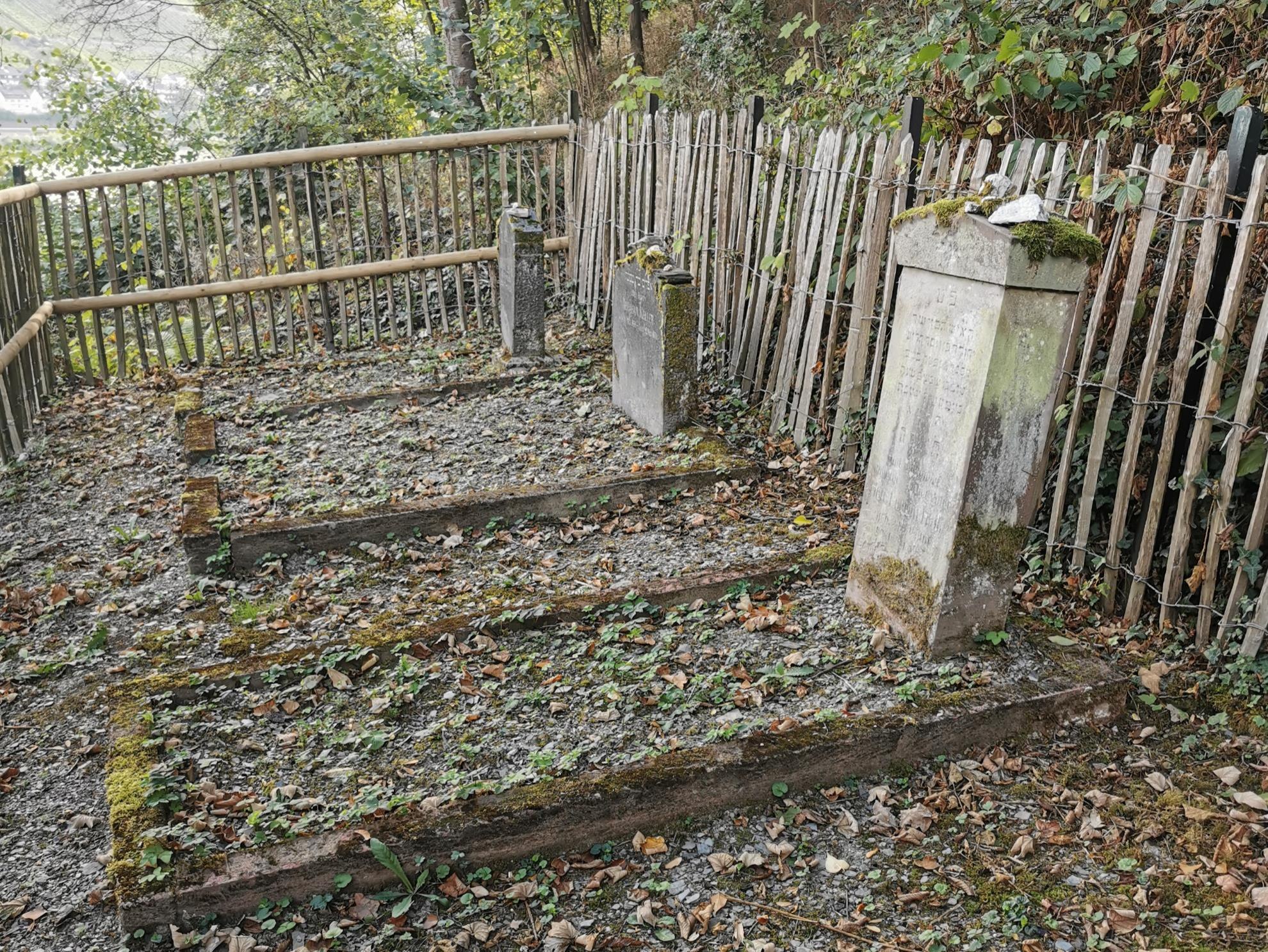 The preserved gravestones bear witness to three burials. The cemetery area is located about one kilometre outside the city, above the Mainzer Straße. The Jewish part is above the Christian graves. There is a separate entrance via a staircase. Before the burial in Bacharach, Jewish parishioners were first buried in Kaub on the right bank of the Rhine and then in Oberheimbach.