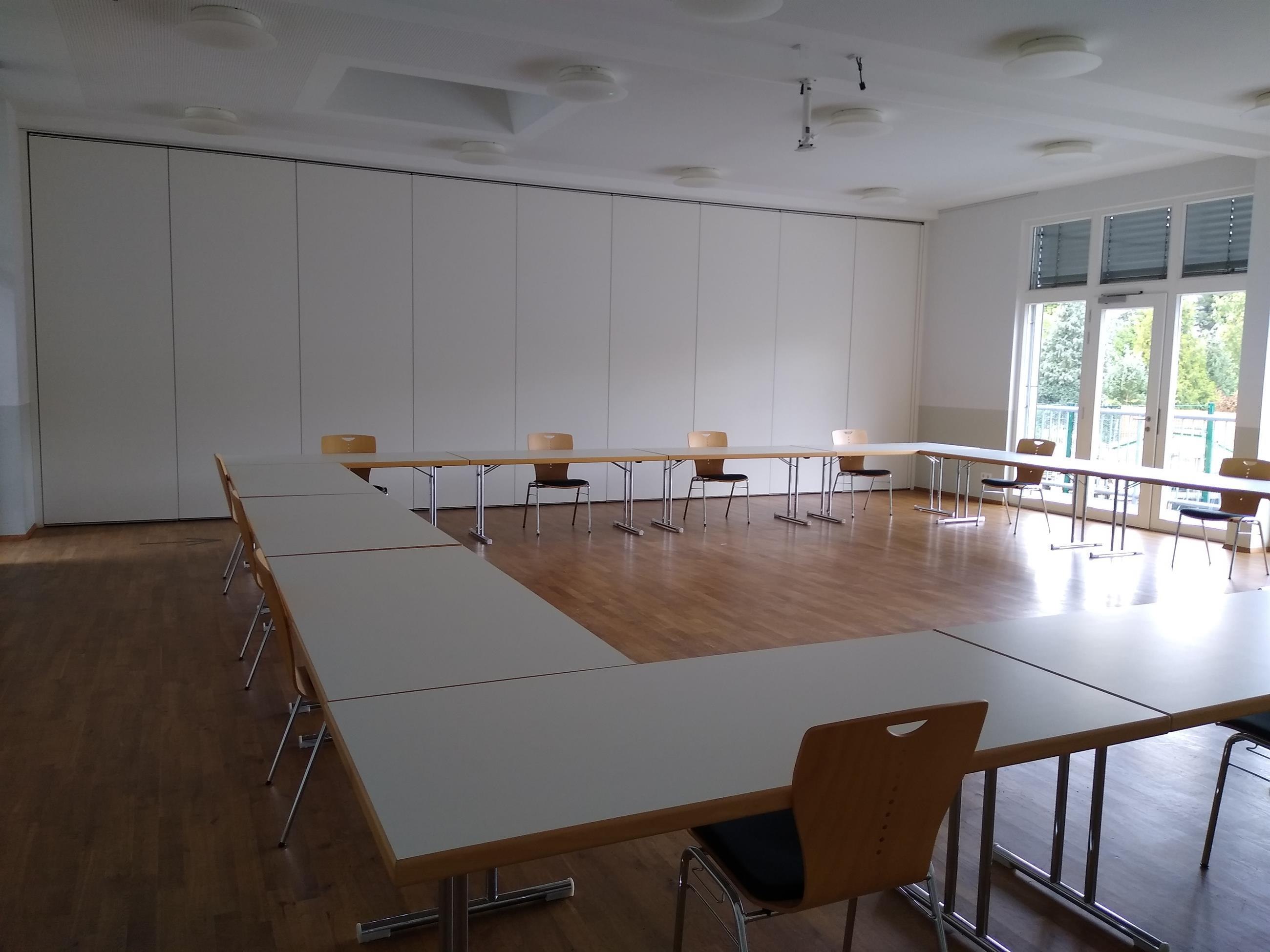 The large hall accommodates up to 110 people. A pure seating arrangement is possible. Additionally, there are 30 tables available (table size 180 cm x 80 cm)